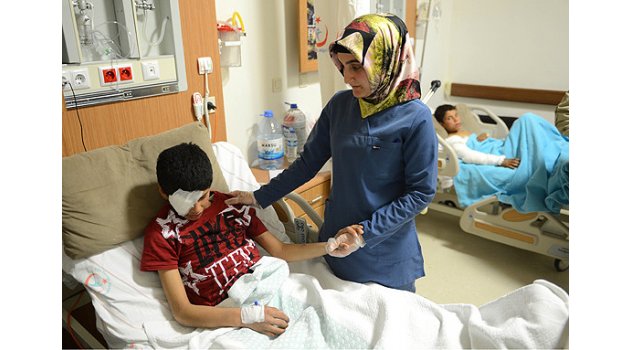 Fırat Kalkanı Harekatı sayesinde terör örgütü DEAŞ'tan temizlenen Bab ilçesinde teröristlerin yola döşediği el yapımı patlayıcının infilak etmesi sonucu ağır yaralanan ve bir gözünü kaybeden Suriyeli çocuk, yaşama tutunduğu Kilis'te patlamada ölen babasının da sağlığına kavuştuğunu sanıyor.15 GÜN ÖNCE BÜYÜK BİR ACI YAŞADITürk Silahlı Kuvvetleri destekli Özgür Suriye Ordusunca DEAŞ'tan temizlenen Bab'da, terör örgütünün kontrolündeyken okulların açılmaması nedeniyle eğitimine devam edemeyen, babasıyla demirci dükkanında çalışmaya başlayan 10 yaşındaki Abdulhedi Humedi, 15 gün önce büyük bir acı yaşadı.Babasıyla bindiği motosikletin DEAŞ'lı teröristlerin ilçeden ayrılmadan önce döşediği el yapımı patlayıcının üzerinden geçerken patlaması sonucu ağır yaralanan çocuk, Kilis'te zorlu bir tedavi sürecinin ardından yaşama tutundu.Bir gözünü kaybettiği saldırıda hayatta kalmanın mutluluğunu yaşayan küçük çocuğa, babasının öldüğü ise henüz söylenmedi."BABAM DA İYİYMİŞ ÇOK ŞÜKÜR"Humedi, yaptığı açıklamada, savaş nedeniyle çok sevdiği okuluna devam edemediğini söyledi.Terör örgütü DEAŞ'ın okulların açılmasını yasaklaması üzerine, babasının demirci dükkanında çalışmaya başladığını anlatan Humedi, Bab DEAŞ'tan temizlenince büyük mutluluk yaşadıklarını ifade etti.DEAŞ'ın ilçeden temizlenmesinin ardından dükkanlarını taşımak için babasıyla dükkanlarına giderken patlama meydana geldiğini belirten Humedi, şunları kaydetti:"İki kamyonun arasından geçerken bir ucu bombaya bağlı ipe takıldık. İp çok inceydi gözle görülmüyordu. Sonra patlama oldu. Ayağa kalktığımda her tarafım kan içindeydi. Babam yerde yatıyordu. Kaldırmaya çalıştım ama kalkmadı. Bir araba geldi. İçindeki adam 'sana ne oldu' deyip babamla beni arabaya bindirdi. İlk önce orada bir hastaneye sonra da buraya getirdiler. Doktorların ve sağlık çalışanlarının gayretleriyle şimdi iyiyim. Babam da iyiymiş çok şükür.""NASIL SÖYLEYECEĞİMİ BİLEMEDİM"Küçük çocuğun eniştesi Ammar Humedi, Abdulhedi'nin yaklaşık 15 gün önce yaşadıkları patlamada ağır yaralandığını söyledi.Yaklaşık 2 yıldır Türkiye'de yaşadığını dile getiren Humedi, Bab'daki ilk müdahalenin ardından Kilis'e getirilen çocuğa refakat ettiğini belirtti.Patlama nedeniyle ağır yaralı olarak getirilen yeğeninin sağlığına Kilis'te kavuştuğunu kaydeden Humedi, "Ancak babasının hayatını kaybettiğinden haberi yok. Bunu nasıl söyleyeceğimi bilemedim." dedi.Türkiye'ye geldiği ilk günden beri iyilikten başka bir şey görmediğini vurgulayan Humedi, Türk hükümetine ve kendileri için seferber olan sağlık çalışanlarına teşekkür etti.YAKINDA TABURCU EDİLECEKKilis Devlet Hastanesi Çocuk Cerrahi Uzmanı Dr. Mustafa Tuşat da Humedi'nin hastaneye getirildiğinde durumunun çok kötü olduğunu, acilen ameliyata alındığını söyledi.Vücutlarının çeşitli yerlerine isabet eden şarapnel parçaları nedeniyle ciddi yaraları olan çocuğun ameliyat sonrası bir süre yoğun bakımda kaldığını anlatan Tuşat, Humedi'nin sağlık durumunun her geçen gün iyiye gittiğini, önümüzdeki günlerde taburcu edileceğini aktardı.